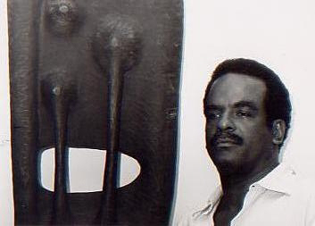Édouard Glissant aux côtés d'une sculpture en bois brûlé de son ami Augustin Cardenas (intitulée Édouard Glissant, sculptée dans un bois de Martinique, à l'Institut martiniquais d'Études dans les années soixante-dix).