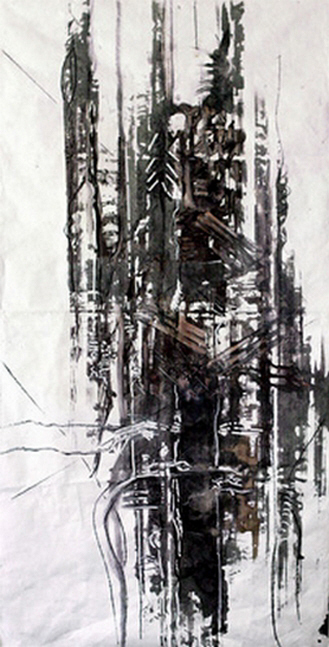L’utilisation des encres frottées et de l’esquisse peut alors révéler la substance « solide » et permanente d’un sens perdu parfois comme dans l’écriture Rongo Rongo de l’Ile de Pâques : stèles végétales, mégalithes de bois, porteurs des mémoires disparues de la communauté désassemblée d’un lieu du pacifique, si petit, et qui résonne pourtant aux au-delà des mers et des terres comme un seuil nécessaire à tous ; Ici, la technique de l’empreinte restitue quelque chose d’essentiel de ces glyphes de bois mystérieux, une présence sacrée et vivante dans les imaginaires de chacun.